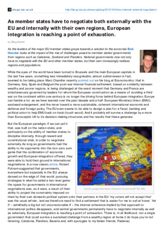 As the leaders of the major EU member states grope towards a solution to the eurocrisis Bob Hancké looks at the impact of the rise of challenges posed to member states’ governments from regions such as Catalonia, Scotland and Flanders. National governments now not only have to negotiate with the EU and other member states, but their own increasingly restless regions and populations.