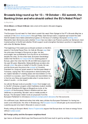 Brussels blog round up for 13 – 19 October – EU summit, theBanking Union and who should collect the EU’s Nobel Prize?