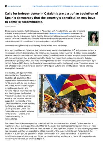 Elections are due to be held in Catalonia in November, with President Artur Mas also promising to hold a referendum on Catalan self-determination. Montserrat Guibernau assesses the prospects for the referendum, noting that the Spanish constitution currently prevents any direct vote on the issue. Despite this, she asks whether the EU could ignore the results of such a referendum given its commitment to promoting democracy in Europe.