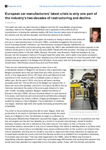 This week has seen car plant closures in Belgium and the UK, consolidation programmes, including a bail-out for Peugeot and GM/Opel, and a squeeze on the profits of all car manufacturers, including the relatively healthy VW. Bob Hancké takes stock of restructuring in the industry over the last two decades, and finds few reasons to be cheerful
