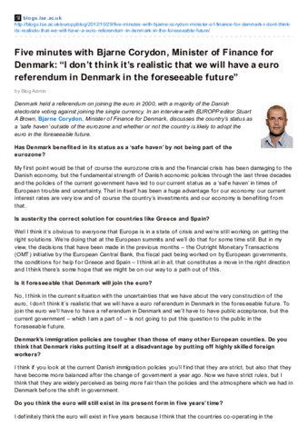 Five minutes with Bjarne Corydon, Minister of Finance forDenmark: “I don’t think it’s realistic that we will have a euroreferendum in Denmark in the foreseeable future”