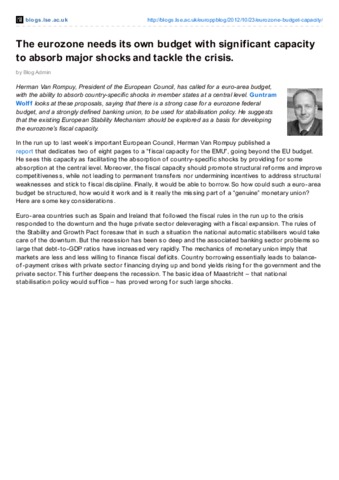Herman Van Rompuy, President of the European Council, has called for a euro-area budget, with the ability to absorb country-specific shocks in member states at a central level. Guntram Wolff looks at these proposals, saying that there is a strong case for a eurozone federal budget, and a strongly defined banking union, to be used for stabilisation policy. He suggests that the existing European Stability Mechanism should be explored as a basis for developing the eurozone’s fiscal capacity.