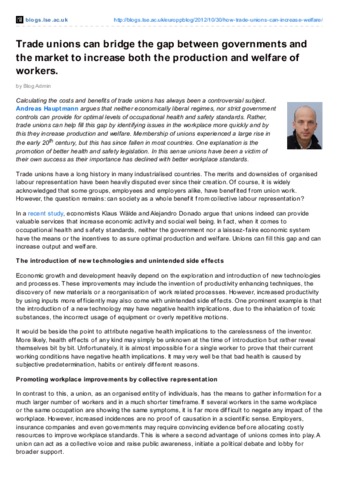 Calculating the costs and benefits of trade unions has always been a controversial subject. Andreas Hauptmann argues that neither economically liberal regimes, nor strict government controls can provide for optimal levels of occupational health and safety standards. Rather, trade unions can help fill this gap by identifying issues in the workplace more quickly and by this they increase production and welfare. Membership of unions experienced a large rise in the early 20th century, but this has since fallen in most countries. One explanation is the promotion of better health and safety legislation. In this sense unions have been a victim of their own success as their importance has declined with better workplace standards.