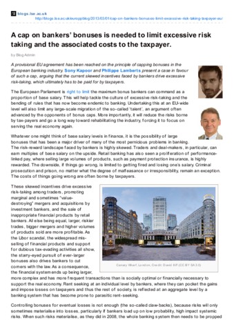 A provisional EU agreement has been reached on the principle of capping bonuses in the European banking industry. Sony Kapoor and Philippe Lamberts present a case in favour of such a cap, arguing that the current skewed incentives faced by bankers drive excessive risk-taking, which ultimately has to be paid for by taxpayers.