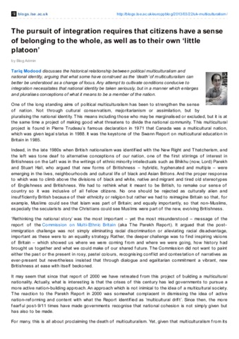 Tariq Modood discusses the historical relationship between political multiculturalism and national identity, arguing that what some have construed as the ‘death’ of multiculturalism can better be understood as a change of focus. Any attempt to cultivate conditions conducive to integration necessitates that national identity be taken seriously, but in a manner which enlarges and pluralises conceptions of what it means to be a member of the nation.
