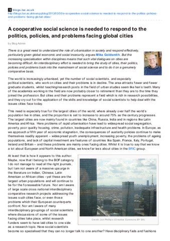 There is a great need to understand the role of urbanisation in society and respond effectively, particularly given global economic and social insecurity, argues Mike Goldsmith. But the increasing specialisation within disciplines means that such vital dialogues on cities are becoming difficult. An interdisciplinary effort is needed to bring the study of cities, their politics, policies and problems back into the mainstream of social science and to do it on a genuinely comparative basis.