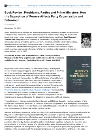 When political science scholars first asserted the essential connection between political parties and democracy, most of the world’s democracies were parliamentary. Yet by the dawn of the twenty-first century, most new democracies had directly elected presidents. David Samuels and Matthew Shugart provide a theoretical framework for analyzing variation in the relationships among presidents, parties, and prime ministers across the world’s democracies, revealing the important ways that the separation of powers alters party organization and behaviour. Jack Blumenau applauds the authors’ enormous data collection project, which examines biographical information of all prime ministers and presidents in democratic countries from 1945 to 2007.
