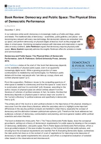 In our extensive online world, democracy is increasingly made up of wikis and blogs, pokes and tweets. The traditional sites of democracy – assemblies, public galleries, and plazas - are becoming less relevant with every new technology. But democratic citizens are embodied, take up space, and perform democracy on physical stages at least as much as they engage with ideas in virtual space. Combining conceptual analysis with interviews and observation in capital cities on every continent, John Parkinson argues that democracy requires physical public space. Marco Scalvini especially admires the insights Parkinson offers for scholars in media and communications.