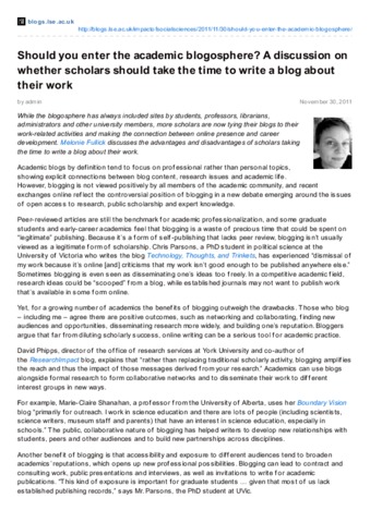 While the blogosphere has always included sites by students, professors, librarians, administrators and other university members, more scholars are now tying their blogs to their work-related activities and making the connection between online presence and career development. Melonie Fullick discusses the advantages and disadvantages of scholars taking the time to write a blog about their work.