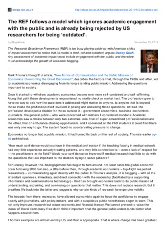 The Research Excellence Framework (REF) is too busy playing catch-up with American styles of impact assessment to notice that its model is tired, old and outdated, argues Danny Quah. Any assessment of academic impact must include engagement with the public, and therefore must acknowledge the growth of academic blogging.