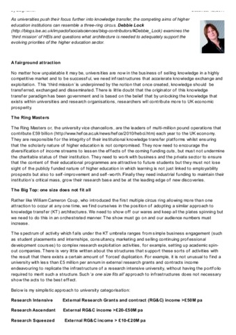 As universities push their focus further into knowledge transfer, the competing aims of higher education institutions can resemble a three-ring circus. Debbie Lock examines the ‘third mission’ of HEIs and questions what architecture is needed to adequately support the evolving priorities of the higher education sector.