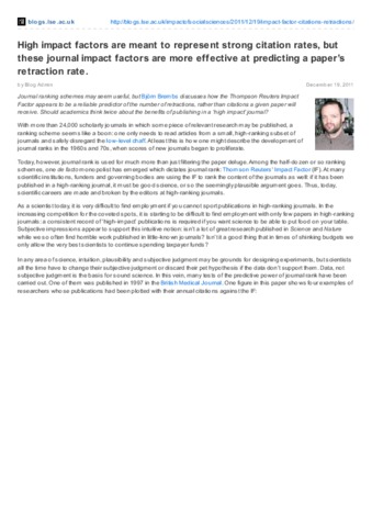 Journal ranking schemes may seem useful, but Björn Brembs discusses how the Thompson Reuters Impact Factor appears to be a reliable predictor of the number of retractions, rather than citations a given paper will receive. Should academics think twice about the benefits of publishing in a ‘high impact’ journal?