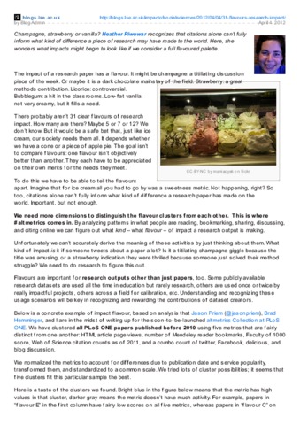 Champagne, strawberry or vanilla? Heather Piwowar recognizes that citations alone can’t fully inform what kind of difference a piece of research may have made to the world. Here, she wonders what impacts might begin to look like if we consider a full flavoured palette.