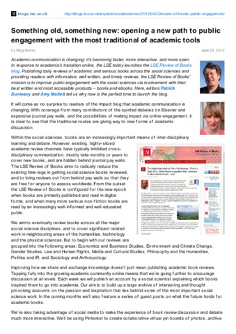 Academic communication is changing; it’s becoming faster, more interactive, and more open. In response to academia’s transition online, the LSE today launches the LSE Review of Books blog. Publishing daily reviews of academic and serious books across the social sciences and providing readers with informative, well written, and timely reviews, the LSE Review of Books’ mission is to improve public engagement with the social sciences via involvement with their best written and most accessible products – books and ebooks. Here, editors Patrick Dunleavy and Amy Mollett tell us why now is the perfect time to launch the blog.