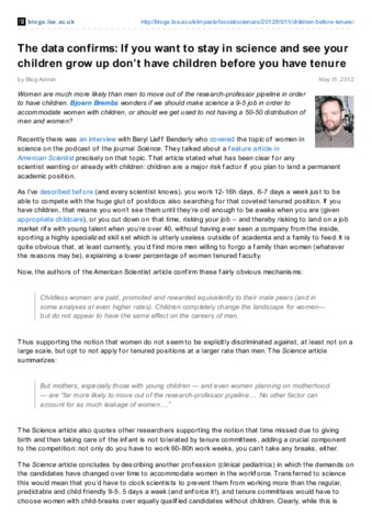 Women are much more likely than men to move out of the research-professor pipeline in order to have children. Bjoern Brembs wonders if we should make science a 9-5 job in order to accommodate women with children, or should we get used to not having a 50-50 distribution of men and women?