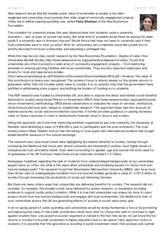 New research shows that the broader public value of universities to society is too often neglected and universities must promote their wide range of community engagement projects if they are to defeat ongoing spending cuts, writes Faiza Shaheen of the New Economics Foundation.