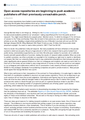 Open access repositories are beginning to push academic publishers off their previously unreachable perch.