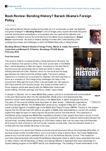 How well has Barack Obama carried out his duties as U.S. commander-in-chief, top diplomat, and grand strategist? In Bending History? a trio of foreign policy experts illuminate the grand promise and the great contradictions of a president who has captured the attention and imagination of citizens around the world like few of his White House predecessors. Robert Mason recommends the book to readers seeking to further their understanding of the contemporary issues and challenges in which US Middle East policy is being formed.
