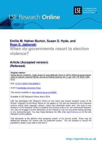 When are governments most likely to use election violence, and what factors can mitigate government incentives to resort to violence? How do the dynamics of election violence differ in the pre- and post-election periods? The central argument of this article is that an incumbent's fear of losing power as the result of an election, as well as institutionalized constraints on the incumbent's decision-making powers, are pivotal in her decision to use election violence. While it may seem obvious to suggest that incumbents use election violence in an effort to fend off threats to their power, it is not obvious how to gauge these threats. Thus, a central objective of this article is to identify sources of information about the incumbent's popularity that can help predict the likelihood of election violence. The observable implications of this argument are tested using newly available cross-national evidence on elections, government use of pre- and post-election violence, and post-election protests from 1981 to 2004.