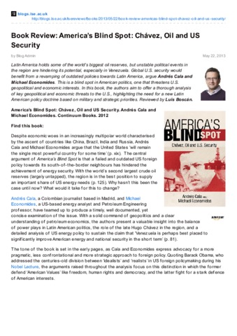 Latin America holds some of the world’s biggest oil reserves, but unstable political events in the region are hindering its potential, especially in Venezuela. Global U.S. security would benefit from a revamping of outdated policies towards Latin America, argue Andrés Cala and Michael Economides. This is a blind spot in American politics, one that threatens U.S. geopolitical and economic interests. In this book, the authors aim to offer a thorough analysis of key geopolitical and economic threats to the U.S., highlighting the need for a new Latin American policy doctrine based on military and strategic priorities. Reviewed by Luis Boscán. America’s Blind Spot: Chávez, Oil and US Security. Andrés Cala and Michael Economides. Continuum Books. 2012