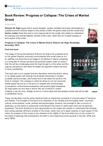 "Progress or Collapse: The Crises of Market Greed." Roberto de Vogli. Routledge. December 2012. --- Roberto De Vogli argues that in recent decades, modern societies have been dominated by a suicidal economic doctrine based on two articles of faith: the greed creed and the market God. Declan Jordan thinks this book is more appropriate for the reader who wishes to understand the interplay and overlap between strands of the crises, rather than an in-depth analysis of each aspect of the crises.