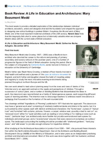 "A Life in Education and Architecture: Mary Beaumont Medd." Catherine Burke. Ashgate. December 2012. --- This book seeks to provide a detailed exploration of the relationships between individual architects, educators, artists and designers that laid the foundation and shaped the approach to designing new school buildings in postwar Britain. It explores the life and work of Mary Medd, one of the most important modernist architects of the 20th century. Kerwin Datu finds that this biography falls short in some places but is historically valuable when we compare Medd’s ideas with the current state of British education.
