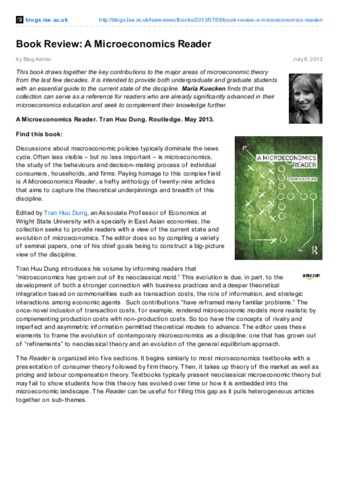 "A Microeconomics Reader." Tran Huu Dung. Routledge. May 2013. --- This book draws together the key contributions to the major areas of microeconomic theory from the last few decades. It is intended to provide both undergraduate and graduate students with an essential guide to the current state of the discipline. Maria Kuecken finds that this collection can serve as a reference for readers who are already significantly advanced in their microeconomics education and seek to complement their knowledge further.