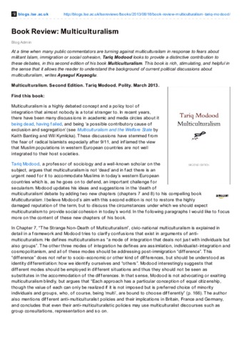 "Multiculturalism." Second Edition. Tariq Modood. Polity. March 2013. --- At a time when many public commentators are turning against multiculturalism in response to fears about militant Islam, immigration or social cohesion, Tariq Modood looks to provide a distinctive contribution to these debates, in this second edition of his book Multiculturalism. This book is rich, stimulating, and helpful in the sense that it allows the reader to understand the background of current political discussions about multiculturalism, writes Aysegul Kayaoglu.