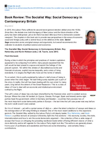 "The Socialist Way: Social Democracy in Contemporary Britain." Roy Hattersley and Kevin Hickson (eds.). I.B. Tauris. June 2013. --- In 2010, the Labour Party suffered its second-worst general election defeat since the 1930s. Since then, the debate over both the legacy of New Labour and the future direction of the party has been widespread, yet so far there has been little input from a democratic socialist viewpoint. The chapters in this book aim to provide new perspectives in the areas of economic, social and foreign policy with a central focus on the defence of the state. Daniel Sage encounters some unoriginal essays and arguments, but overall recommends this collection to students of political science and economics.