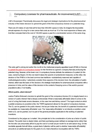 LSE’s Sivaramjani Thambisetty discusses the legal and strategic implications for the pharmaceutical industry of the Indian decision to uphold the grant of the first compulsory license on a patented drug.