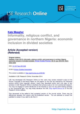 This article examines processes of economic inclusion in divided societies, with a focus on both religious and formal-informal divides. Drawing on recent fieldwork in the northern Nigerian cities of Kano and Kaduna, the article challenges the assumption that identity-based informal organization intensifies violent social divisions, and that taxation and linkages with the state foster more stable and inclusive governance. A range of informal sector activities provides insights into escalating religious conflict and uneven patterns of formal inclusion in interreligious relations. Attention is focused on the relative role of informal institutions and formal interventions such as taxation in diffusing or exacerbating conflict at the grassroots level