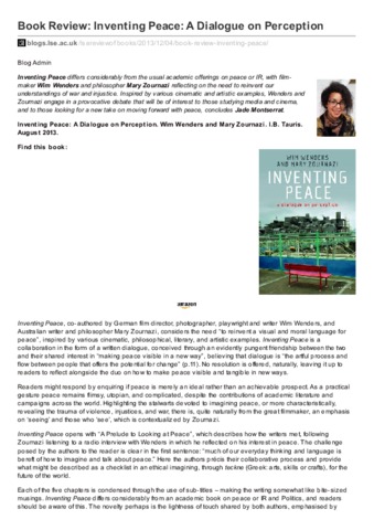 "Inventing Peace: A Dialogue on Perception." Wim Wenders and Mary Zournazi. I.B. Tauris. August 2013. --- "Inventing Peace" differs considerably from the usual academic offerings on peace or IR, with film-maker Wim Wenders and philosopher Mary Zournazi reflecting on the need to reinvent our understandings of war and injustice. Inspired by various cinematic and artistic examples, Wenders and Zournazi engage in a provocative debate that will be of interest to those studying media and cinema, and to those looking for a new take on moving forward with peace, concludes Jade Montserrat.