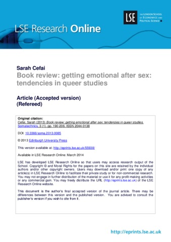 This article reviews three recent queer studies anthologies: Queer Methods and Methodology: Intersecting Queer Theories and Social Science Research, by Kath Browne and Catherine J. Nash (2010), Anarchism & Sexuality: Ethics, Relationships and Power by Jamie Heckert and Richard Cleminson (2011), and After Sex? On Writing Since Queer Theory, by Janet Halley and Andrew Parker (2011). A brief synopsis of the books is followed by discussion on three key observations. First, I discuss the specificity of the queer ‘body’, particularly with regard to the scholarly subjectivity articulated by contributors to these anthologies. Second, I discuss the distillation of queer identity from the field of queer corporeality as a specific move to embrace anti-identitarianism through conceiving identity as fluid. Lastly, questions of queer and identity are reconsidered as methodologically specific and, as such, as entailing sensitivity to the movement of concepts between the different epistemological fields of knowledge called the social sciences and the arts and humanities. Through discussion of these observations, this review aims to stimulate thought and reflection on these texts as responding to and participating in the highly contested institutionalisation of queer studies in the academy.
