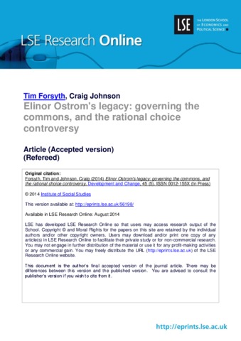 Elinor Ostrom's legacy: governing the commons, and the rational choice controversy