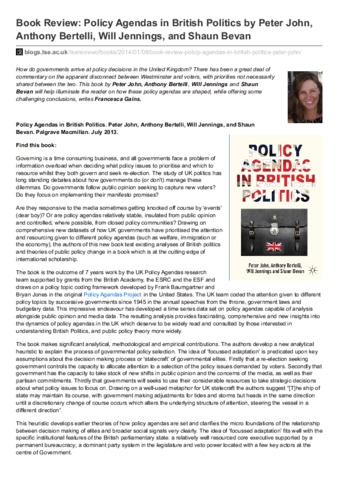 "Policy Agendas in British Politics." Peter John, Anthony Bertelli, Will Jennings, and Shaun Bevan. Palgrave Macmillan. July 2013. --- How do governments arrive at policy decisions in the United Kingdom? There has been a great deal of commentary on the apparent disconnect between Westminster and voters, with priorities not necessarily shared between the two. This book by Peter John, Anthony Bertelli, Will Jennings and Shaun Bevan will help illuminate the reader on how these policy agendas are shaped, while offering some challenging conclusions, writes Francesca Gains.