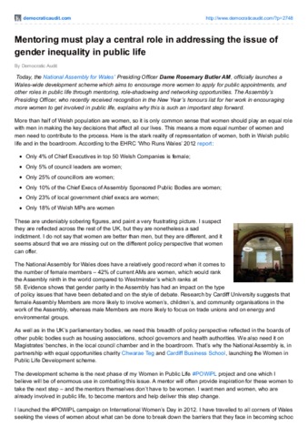 Today, the National Assembly for Wales’ Presiding Officer Dame Rosemary Butler AM, officially launches a Wales-wide development scheme which aims to encourage more women to apply for public appointments, and other roles in public life through mentoring, role-shadowing and networking opportunities. The Assembly’s Presiding Officer, who recently received recognition in the New Year’s honours list for her work in encouraging more women to get involved in public life, explains why this is such an important step forward.