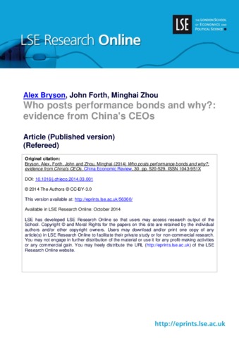 Despite their theoretical value in tackling principal–agent problems at low cost to firms there is almost no empirical literature on the prevalence and correlates of performance bonds posted by corporate executives. We show that they are an important feature in today's CEO labour market in China: around one-tenth of corporations deploy performance bonds and they are equivalent to around 14% of CEO cash compensation. Consistent with principal–agent theory bonds are negatively associated with firm sales volatility. The complementarity between bonds and other incentive mechanisms such as bonuses and stock holding is consistent with optimal reward structures for multi-tasking agents. Those CEOs posting bonds are higher in the Communist Party ranks, were promoted via tournaments, and run larger firms, findings consistent with using bonds as an incentive to attract and retain the most able workers. Although state-owned enterprises are just as likely as privately owned ones to use bonds in CEO contracts, some of the theoretical predictions which assume profit-maximising firms do not hold where the state has an ownership stake.