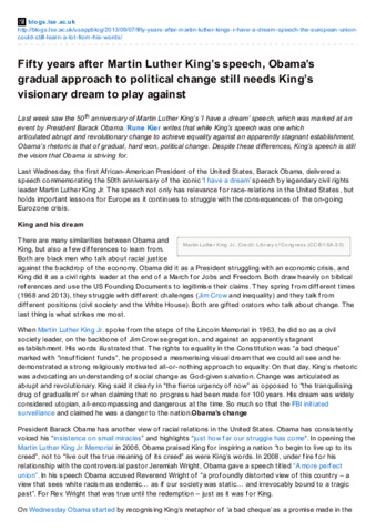 Last week saw the 50th anniversary of Martin Luther King’s ‘I have a dream’ speech, which was marked at an event by President Barack Obama. Rune Kier writes that while King’s speech was one which articulated abrupt and revolutionary change to achieve equality against an apparently stagnant establishment, Obama’s rhetoric is that of gradual, hard won, political change. Despite these differences, King’s speech is still the vision that Obama is striving for.