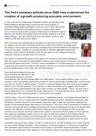 In June, much to the consternation of financial markets, the Chairman of the Federal Reserve, Ben Bernanke, warned that the current program of Quantitative Easing (QE) would likely to come to an end in 2014. But has this measure been effective in stimulating recovery? Looking at QE’s record, Steven Horwitz argues that by paying a small amount of interest on reserve balances, the Fed has discouraged banks from lending, leading to a de facto bailout program. Now, the Fed faces the very real problem of how to avoid inflation as QE ends and recovery begins.