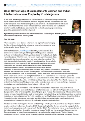"Age of Entanglement: German and Indian Intellectuals across Empire." Kris Manjapara. Harvard University Press. January 2014. --- In this book, Kris Manjapara sets out to explore patterns of connection linking German and Indian intellectuals from the nineteenth century to the years after the Second World War. The author attempts to trace the intersecting ideas and careers of a diverse collection of individuals from South Asia and Central Europe who shared ideas, formed networks, and studied one another’s worlds. Ankit Kumar recommends this book to those studying world history, geopolitics, postcolonialism and development.