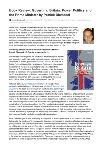 "Governing Britain: Power Politics and the Prime Minister." Patrick Diamond. I.B. Tauris. November 2013. --- In this book, Patrick Diamond examines the administrative and political machinery serving the Prime Minister, and considers how it evolved from the early years of New Labour to the election of the Coalition Government in 2010. The author attempts to provide an analysis which considers the continuing power of the civil service, the tensions between permanent officials and political aides, and the hard grind of achieving change from the centre in Whitehall. While the author has a clear, readable style and his arguments feel considered and well thought through, Matthew Wargent finds that the real strength of this book lies in the data he has to offer.