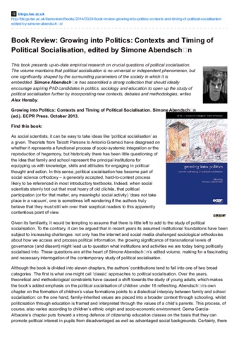 Book review: Growing into politics: contexts and timing of political socialisation, edited by Simone Abendschӧn.