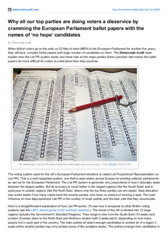 When British voters go to the polls on 22 May to elect MEPs to the European Parliament for another five years, they will face complex ballot papers with large number of candidates on them. The Democratic Audit team explain how the List PR system works and show how all the major parties follow practices that makes the ballot papers far more difficult for voters to understand than they could be.