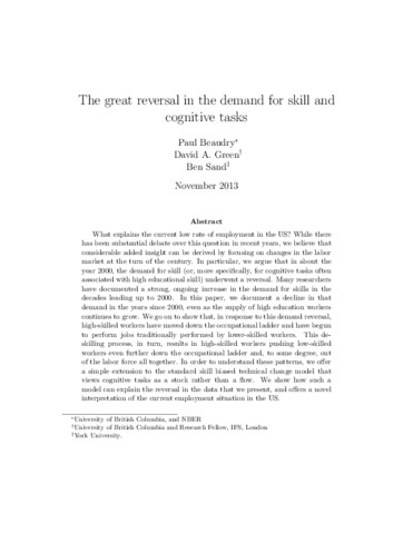 What explains the current low rate of employment in the US? While there has been substantial debate over this question in recent years, we believe that considerable added insight can be derived by focusing on changes in the labor market at the turn of the century. In particular, we argue that in about the year 2000, the demand for skill (or, more specifically, for cognitive tasks often associated with high educational skill) underwent a reversal. Many researchers have documented a strong, ongoing increase in the demand for skills in the decades leading up to 2000. In this paper, we document a decline in that demand in the years since 2000, even as the supply of high education workers continues to grow. We go on to show that, in response to this demand reversal, high-skilled workers have moved down the occupational ladder and have begun to perform jobs traditionally performed by lower-skilled workers. This de- skilling process, in turn, results in high-skilled workers pushing low-skilled workers even further down the occupational ladder and, to some degree, out of the labor force all together. In order to understand these patterns, we offer a simple extension to the standard skill biased technical change model that views cognitive tasks as a stock rather than a flow. We show how such a model can explain the reversal in the data that we present, and offers a novel interpretation of the current employment situation in the US.