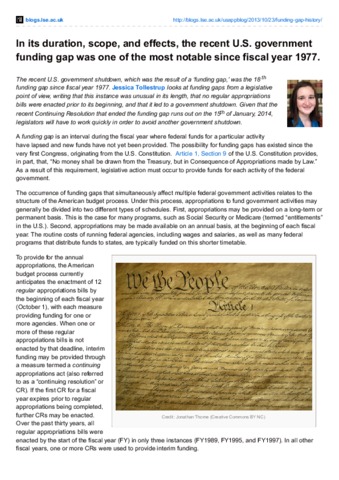 The recent U.S. government shutdown, which was the result of a ‘funding gap,’ was the 18th funding gap since fiscal year 1977. Jessica Tollestrup looks at funding gaps from a legislative point of view, writing that this instance was unusual in its length, that no regular appropriations bills were enacted prior to its beginning, and that it led to a government shutdown. Given that the recent Continuing Resolution that ended the funding gap runs out on the 15th of January, 2014, legislators will have to work quickly in order to avoid another government shutdown.
