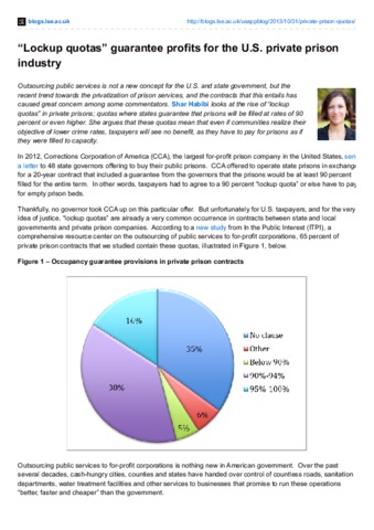 Outsourcing public services is not a new concept for the U.S. and state government, but the recent trend towards the privatization of prison services, and the contracts that this entails has caused great concern among some commentators. Shar Habibi looks at the rise of “lockup quotas” in private prisons; quotas where states guarantee that prisons will be filled at rates of 90 percent or even higher. She argues that these quotas mean that even if communities realize their objective of lower crime rates, taxpayers will see no benefit, as they have to pay for prisons as if they were filled to capacity.