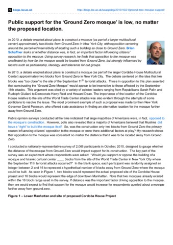 In 2010, a debate erupted about plans to construct a mosque (as part of a larger multicultural center) approximately two blocks from Ground Zero in New York City, with opposition centering around the perceived insensitivity of locating such a building so close to Ground Zero. Brian Schaffner looks at whether distance was, in fact, an important factor influencing citizens’ opposition to the mosque. Using survey research, he finds that opposition to the mosque was unaffected by how far the mosque would be located from Ground Zero, but strongly influenced by factors such as partisanship, ideology, and tolerance for out groups.