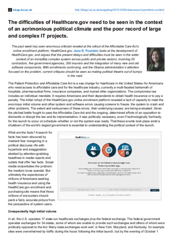 The past week has seen enormous criticism leveled at the rollout of the Affordable Care Act’s online enrollment platform, HealthCare.gov. Jane E. Fountain looks at the development of HealthCare.gov, and argues that the present delays and difficulties must be seen in the wider context of an incredibly complex system across public and private sectors, involving 55 contractors, five government agencies, 300 insurers and the integration of many new and old software components. With enrollments continuing, and the Obama administration’s attention focused on the problem, current critiques should be seen as making political theatre out of bumps in the road.