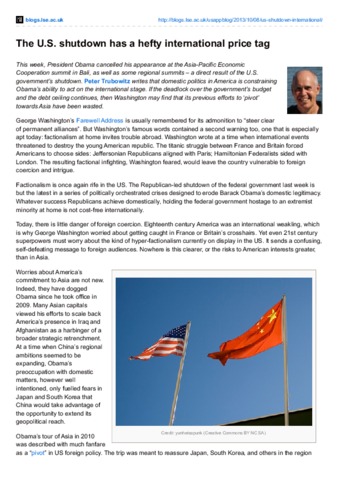 This week, President Obama cancelled his appearance at the Asia-Pacific Economic Cooperation summit in Bali, as well as some regional summits – a direct result of the U.S. government’s shutdown. Peter Trubowitz writes that domestic politics in America is constraining Obama’s ability to act on the international stage. If the deadlock over the government’s budget and the debt ceiling continues, then Washington may find that its previous efforts to ‘pivot’ towards Asia have been wasted.