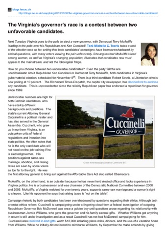 Next Tuesday Virginia goes to the polls to elect a new governor, with Democrat Terry McAuliffe leading in the polls over his Republican rival Ken Cuccinelli. Toni-Michelle C. Travis takes a look at the election race so far, writing that both candidates’ campaigns have been overshadowed by ethical questions, with many voters viewing the pair unfavorably. She argues that McAuliffe’s lead among women, as well as Virginia’s changing population, illustrates that candidates now must appeal to the mainstream, and not the ideological fringe.